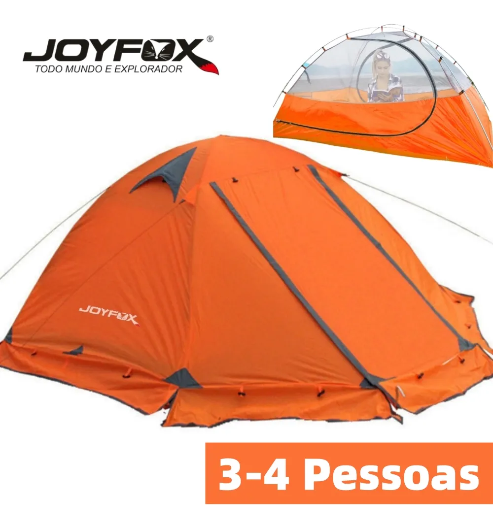 Marca: JOYFOX Modelo: J-289 Tamanho: 210×(50+180+50)×115 cm (comprimento×largura×altura) Barraca externa: 210T revestimento impermeável PU3500MM poliéster, adesivo à prova d’água Inferior da barraca: Revestimento impermeável 210D PU4000MM Oxford conta inferior, adesivo à prova d’água Barraca interna: 210T poliéster respirável + B3 Suporte: Suporte de alumínio de aviação Tamanho do pacot: 45×17×16cm Peso : 2.7KG Cor: Laranja Características: Existem janelas de ventilação (boa ventilação), existem extensões em ambas as extremidades (pode colocar equipamentos), os lados frontal e traseiro se estendem 60cm, e também existem extensões à esquerda e à direita que podem ser penduradas no chão para aumentar a resistência ao vento.A tenda interna é elegante e generosa. Há ganchos de luz na parte superior da barraca e saias de neve ao redor da barraca para aumentar a resistência à chuva.
